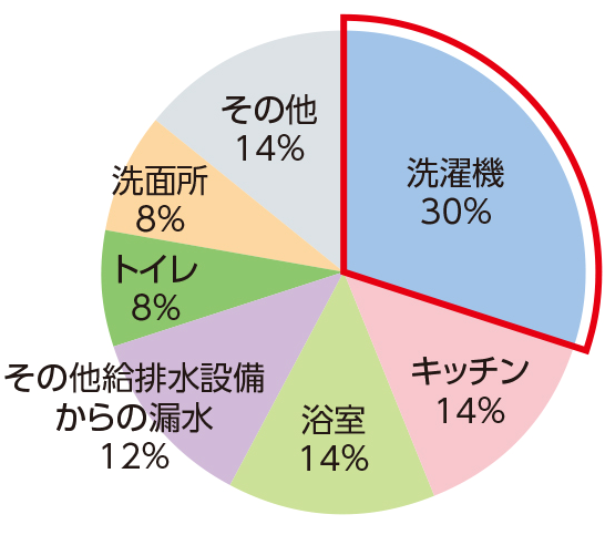 漏水事故の保険金請求件数は、火災事故の5倍(※)で、洗濯機の事故が最も多くなっています。また、水道管の凍結が原因で、漏水事故が起こるケースもあります。