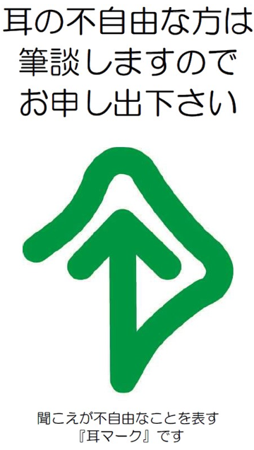 耳や言葉の不自由なお客さまに安心してご来店いただけるよう、弊社本店店頭に 「耳マーク」 を掲示しております。筆談について、どうぞお気軽にお申し出ください。