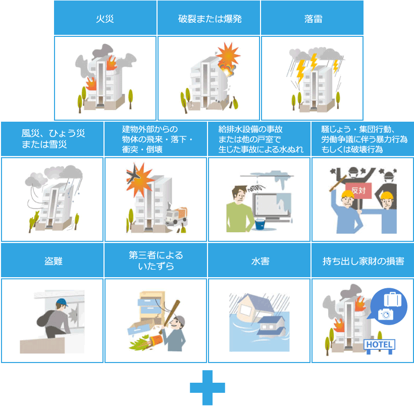 以下の事故により入居物件が半損以上になり、家財保険金をお支払いする場合、新たに賃貸住宅を賃借する費用または宿泊施設を利用する費用をお支払いします。ただし、損害が生じたときから1ヶ月以内に実際にかかった費用に限ります。