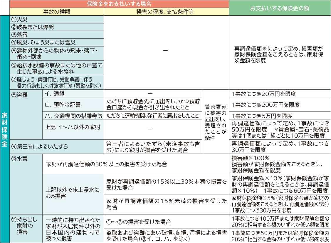 次のような事故によって家財に損害が生じた場合に保険金をお支払いします。下表【お支払いする家財保険金】をご覧ください。
