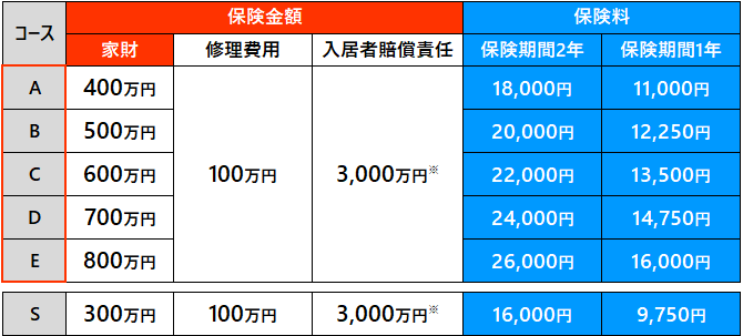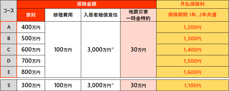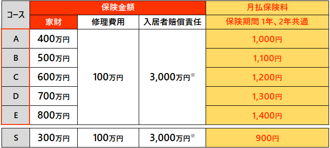 保険金額(補償限度額)・保険料コース表(クレジットカード払・家賃保証会社払)